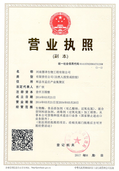 鄭州慧澤生化科技有限公司是一家充滿朝氣的科研生產(chǎn)型高技術(shù)企業(yè)。目前公司業(yè)務(wù)主要集中在精細(xì)化工、食品化工和微生物制劑行業(yè)。公司現(xiàn)已建成鄭州、焦作、新鄉(xiāng)三個生產(chǎn)基地,其中河南新鄉(xiāng)輝縣孟莊生產(chǎn)基地占地70畝,總投資達(dá)1.2億。現(xiàn)擁有年產(chǎn)100000噸過氧化氫消毒劑,年產(chǎn)8000噸的過氧化鈣和年產(chǎn)5000噸的雙乙酸鈉的生產(chǎn)線,同時開設(shè)有生產(chǎn)總量5000噸的枯草芽孢桿菌、地衣芽孢桿菌等微生態(tài)制劑發(fā)酵生產(chǎn)車間。公司始終堅(jiān)持“以人為本,科技興企,品質(zhì)優(yōu)良,用戶滿意”的經(jīng)營宗旨。為客戶創(chuàng)造價值更多的價值...